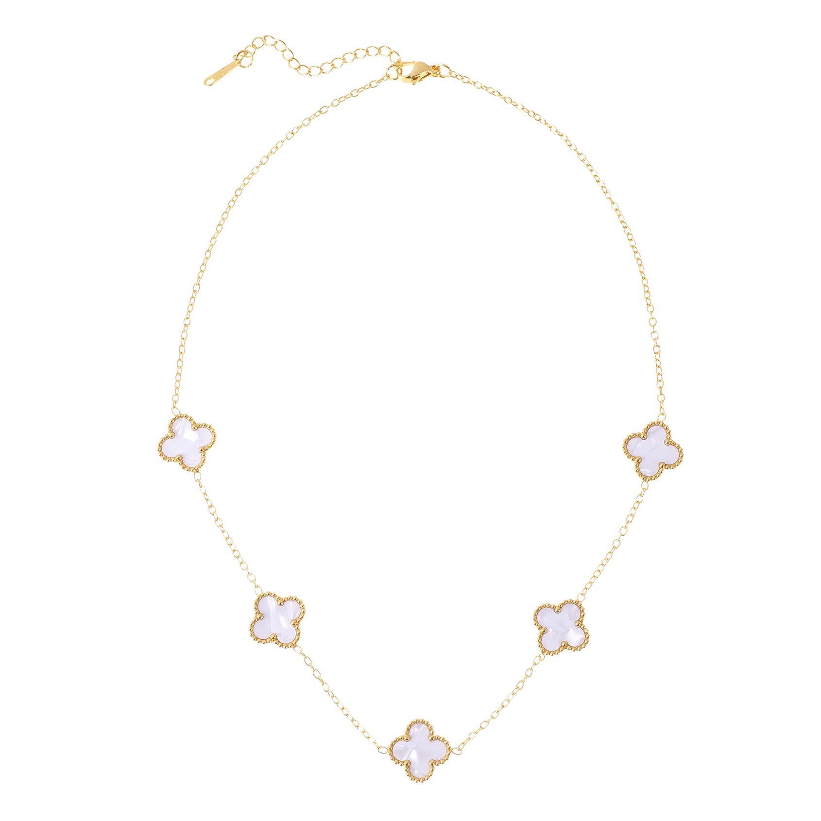 Bring timeless elegance and a touch of good fortune to your look with this stunning 14K Gold-Plated Four-Leaf Clover Necklace. Featuring a beautifully polished Mother of Pearl or Black Onyx gemstone clover pendant, this necklace adds a luxurious sparkle to any outfit. The iconic lucky-flower design symbolizes love, hope, faith, and luck — making it a meaningful choice for everyday wear or gifting. Crafted with high-quality plating and a smooth gemstone finish, this necklace is lightweight, durable, and designed for comfortable all-day wear. The adjustable chain allows you to style it at your perfect length, whether worn alone for effortless sophistication or layered with your favorite pieces for a chic, modern look.