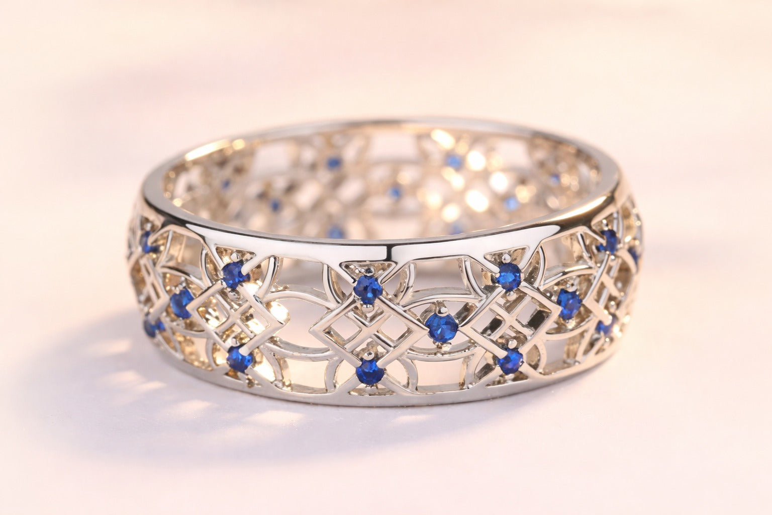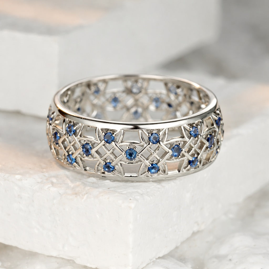 This elegant band ring is meticulously crafted from sterling silver, showcasing a beautiful and intricate filigree design that wraps continuously around the finger. The delicate openwork pattern is gracefully adorned with multiple small, round sapphire gemstones, adding a captivating touch of vibrant blue sparkle to the piece. This sophisticated ring combines classic appeal with artistic detail, making it a versatile accessory suitable for enhancing your everyday style or complementing a special occasion outfit with its unique charm and brilliant accents.