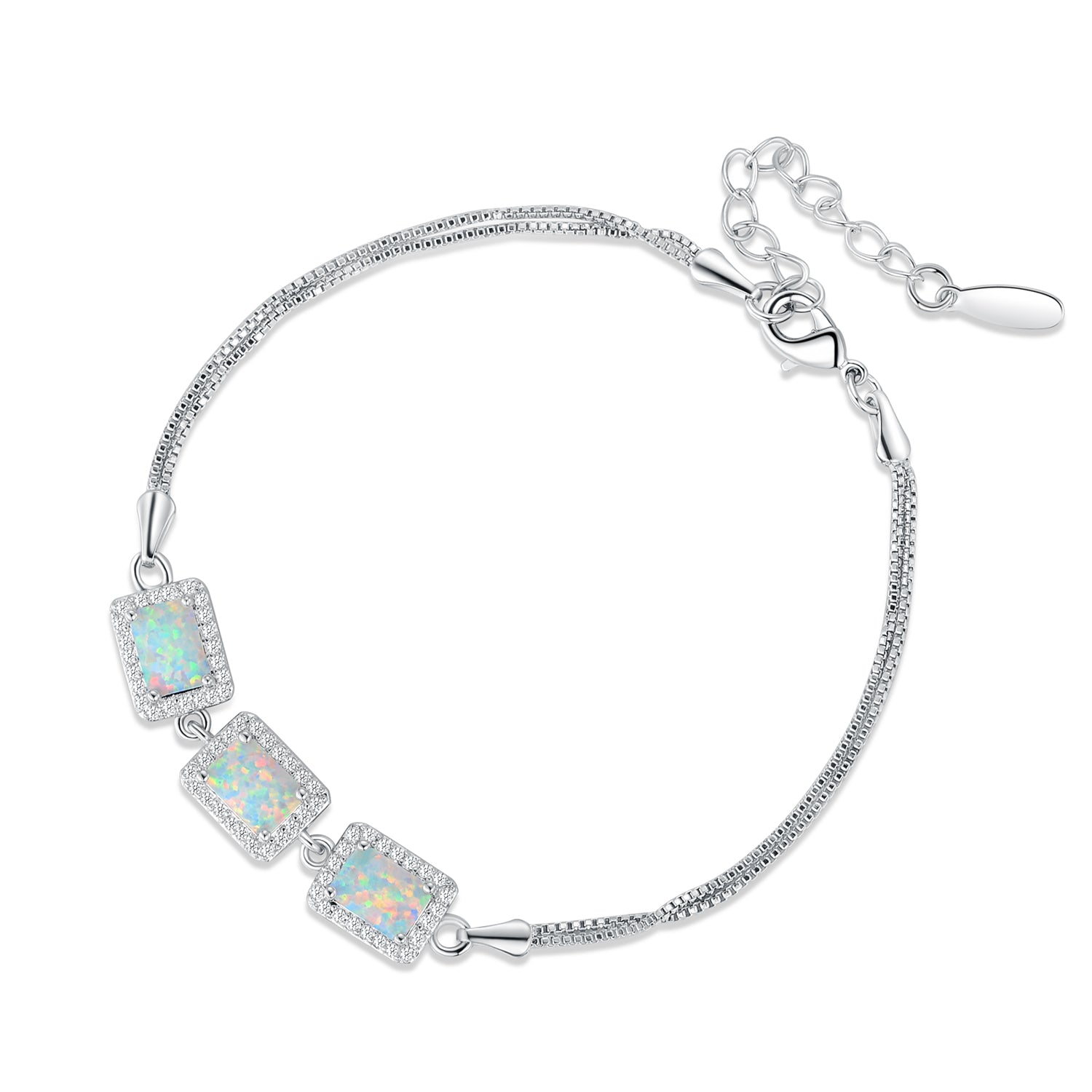 Adorn your wrist with this exquisite Blue Fiery Opal Halo Bracelet, meticulously crafted from luxurious 14K White Gold. This elegant piece showcases three captivating rectangular blue opal stones, each brilliantly framed by a sparkling halo of smaller accent stones that enhance their natural radiance. The bracelet features a delicate double-strand chain design, providing a refined look and comfortable wear. It is secured with a reliable lobster claw clasp and includes an extender chain, allowing for an adjustable and perfect fit for any occasion.