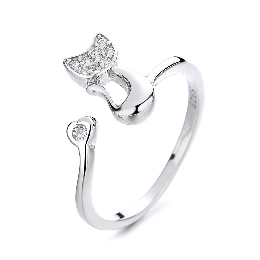 Crafted from high-quality sterling silver, this ring features a whimsical cat design that adds a playful touch to your look. The crystals embedded in the cat's silhouette bring a touch of shimmer and sophistication.