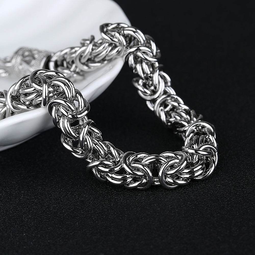 The links in a Byzantine bracelet are usually rounded or square in shape, and are woven together to create a dense, sturdy chain. The links can be made from a variety of materials, including gold, silver, and stainless steel, and can be left plain or decorated with embellishments such as gems or beads.